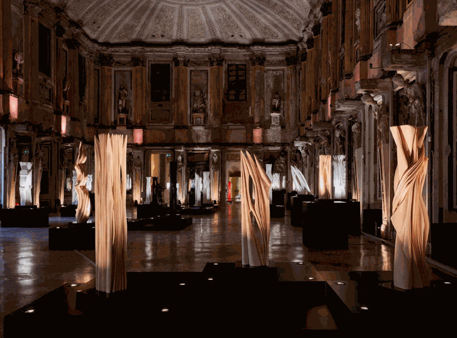 Powerful and refined sculptures transform the Sa - la delle Cariatidi of the Palazzo Reale into a kind of enchanted place. Of bronze and marble